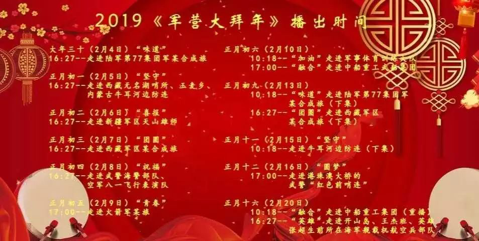 2019年的新春前夕,解放軍新聞傳播中心廣播電視部,再啟《軍營大拜年》為兵服務(wù)的新征程。多支文藝輕騎隊進(jìn)寒區(qū)、入戈壁、上高原、下海防、走邊關(guān)、進(jìn)班排,把軍委的關(guān)懷與問候送到基層,把全國人民的祝福帶給官兵。秉承“真誠為兵服務(wù)、真實記錄過程”,節(jié)目組把豐富多彩的基層慰問活動,精心制作成為系列節(jié)目,從大年三十到正月十五,每天在央視熒屏上給全軍戰(zhàn)友和電視觀眾拜大年。