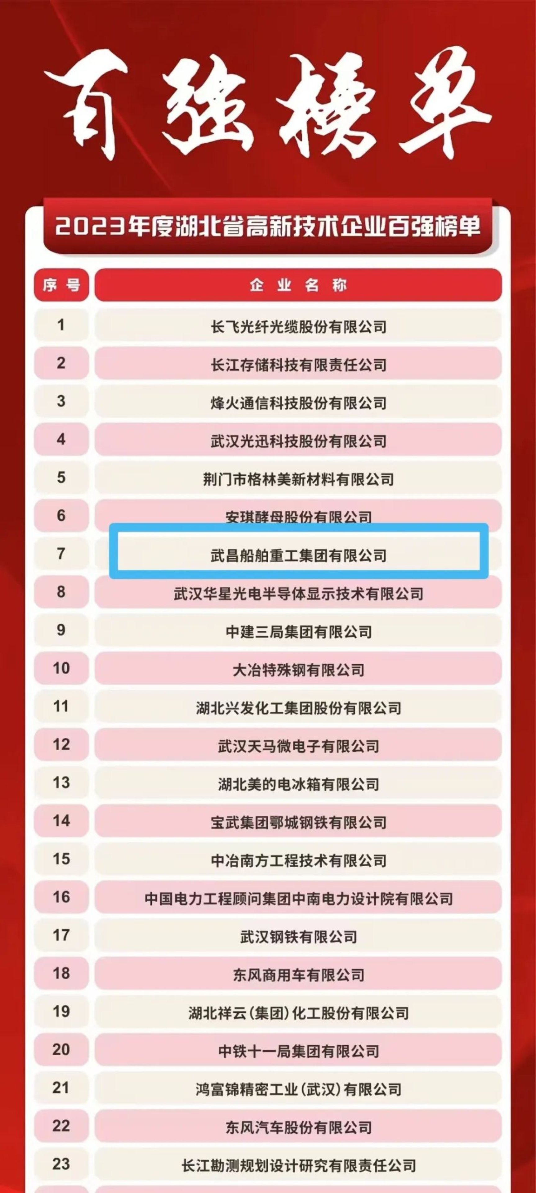 3月7日,湖北省科技廳組織召開了2024年湖北省高新技術(shù)企業(yè)“春曉行動(dòng)”啟動(dòng)會(huì),會(huì)上發(fā)布了湖北省2023年度高新技術(shù)企業(yè)百?gòu)?qiáng)名單,中國(guó)船舶集團(tuán)武昌造船繼2022年度后再次上榜,且排名從2022年度的第62名上升至第7名。
