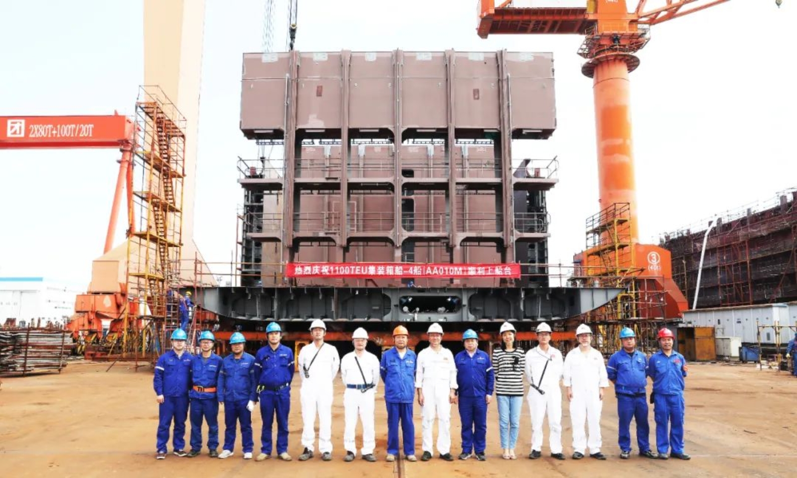 10月8日,由武昌造船承建的1100TEU集裝箱船4號船順利實現上船臺節(jié)點。至此該批一型四艘船最后一艘船正式轉入船臺搭載階段,為船舶順利交付奠定堅實基礎。船東、船檢及參建單位相關負責人參加儀式。